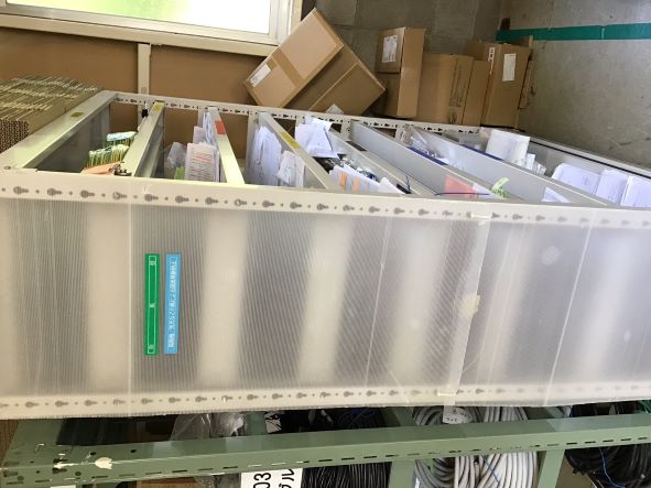 改善前:夏、扇風機をつけるようになると、1枚物の図面が風で飛散し、行方不明になったりし、再発行してもらう手間があったり、存在消えてるため、いつまでも切らない状況が発生する可能性アリ。(現に棚裏に飛んだことも数度ある。)