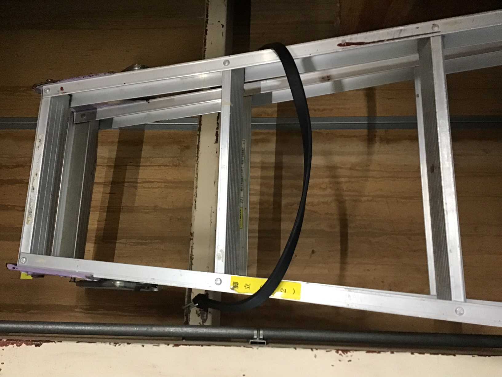 改善前:最近、震度5強クラスの地震が全国各地で頻発しております。転倒すると危ないものが社内には多数存在しますが、No.2簡易リフト横の階段下に脚立を立てかけており、転倒防止策が施されていません。