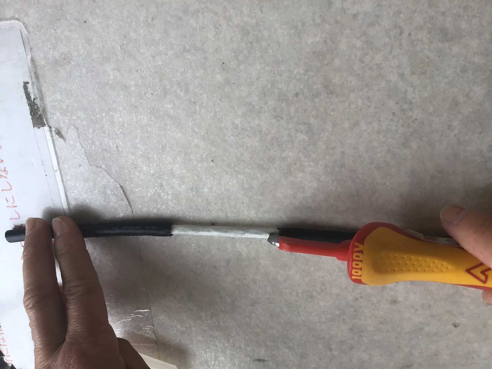 - ケーブル線のシースを剥く際、改善前は「絶縁電工ナイフ」を使い、手むきをしていた。そのため、かなりの力と時間がかかっていた。
