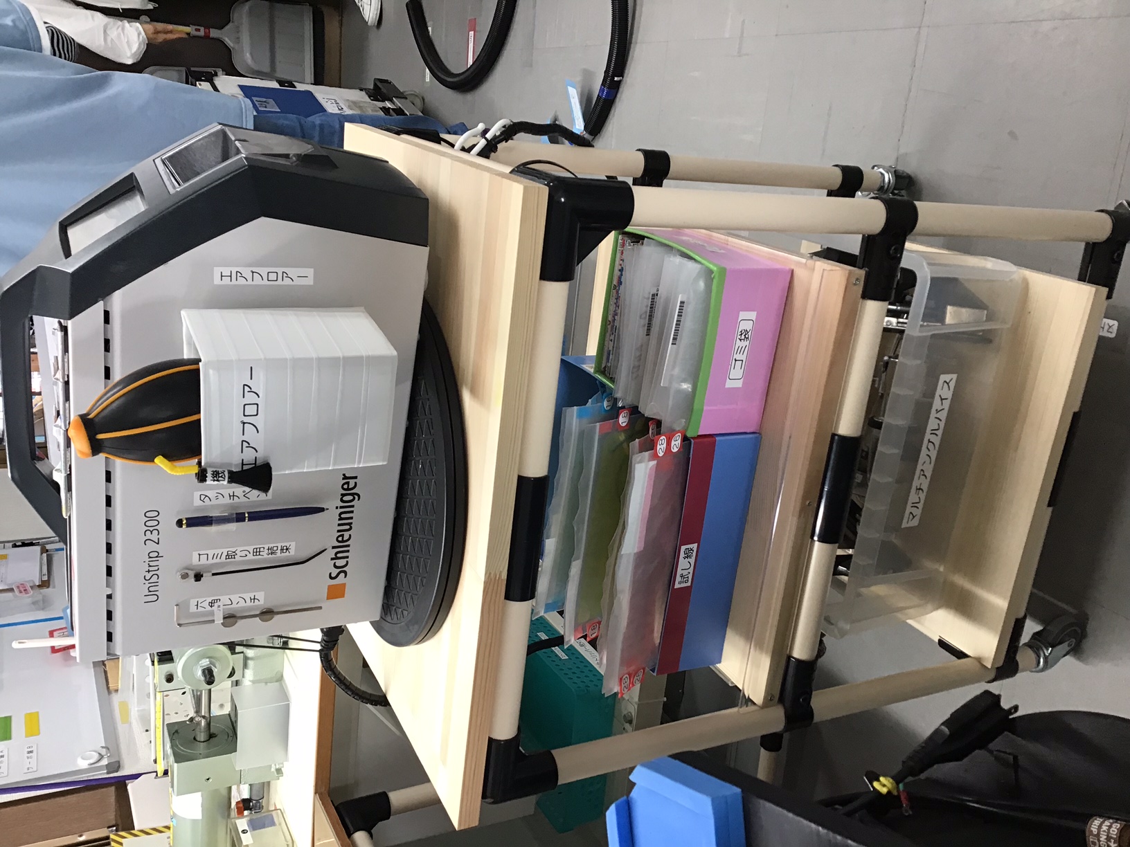 - シュロニガー用の作業台を作成しました。中段・下段に棚板を取り付けていますが、袋、試し線など、置いているものが軽いとキャスターを動かしたり止めたりした時に滑り落ちてしまう可能性があります。