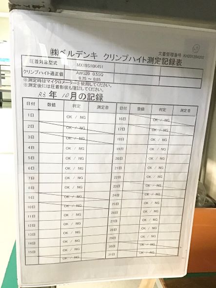 改善後:それぞれのアプリにクリンプハイト表をつけるようにしたので、測定済みかどうか一目で分かるようになった。測定値をすぐに書けるように記入部分を開けるようにしたので、手間を減らせた。