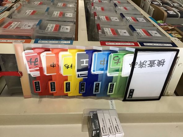 改善後:7色に分かれている壁掛けポケットを購入してもらい、レタツイン横の縦の空間を利用し、表示カードもポケットと色を合わせた。見やすく出し入れもしやすくなった。