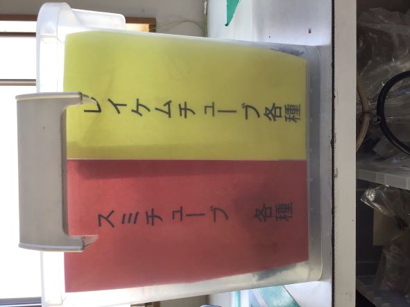 改善後:スミチューブとレイケムチューブが一目で分かるように、袋と表示を色分けし、探しやすいように大きさの順で並べるようにした。チューブの間違いもなく、探す時間の短縮にもなりました。