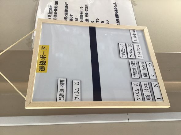 改善後:残り少なくなってきた時点ですぐに作れない時は、そのままにするのではなく、みんなが分かるように「連絡ボード」を設置しました。部材それぞれのマグネットを作り、補充したい物をボードに貼る事にし、南原さんの手が空いた時等にも気づいてもらえるようになりました。(画像あり) - 改善前