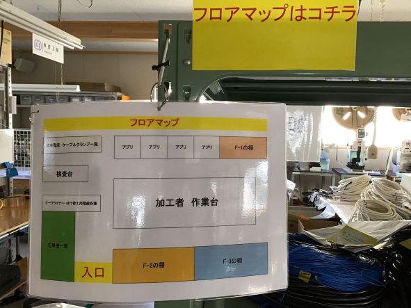 改善前:現在、どのチームでもありますが、新人の方や別のチームの人が材料や圧着機を探しに来た際に、例えば「F-1」の棚がどこにあるのかが分からず苦労していることがありました。