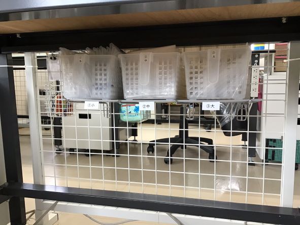 改善前:菱和チームの個人の机には、加工道具等をつるせる網が設置してあります。机の下の足元の空間を有効利用するために、ダンボールを板のかわりにヒモでつるして、その上にカゴを置いていたのですが、ダンボールは紙なので、カゴを置くとたわんでゆがみ、見た目も悪く、使い勝手も悪かった。